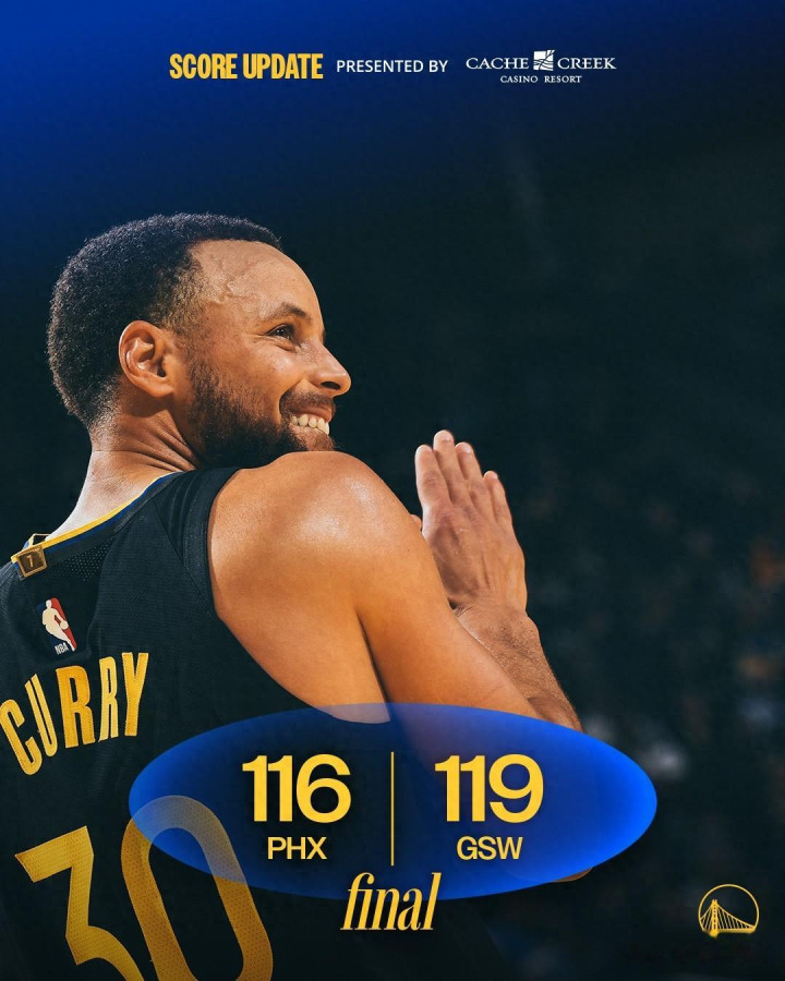 恭喜金州勇士战胜菲尼克斯太阳,战绩排名反超灰熊,重回西部前八!LET’S GO warriors!